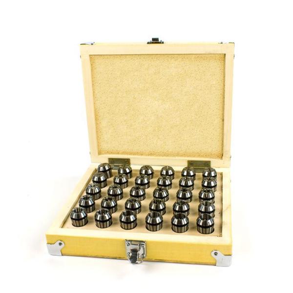 ER20 collet set has 30 collets ranging in size from 3/64" to 1/2" by 1/64" increment. Includes wooden storage box.